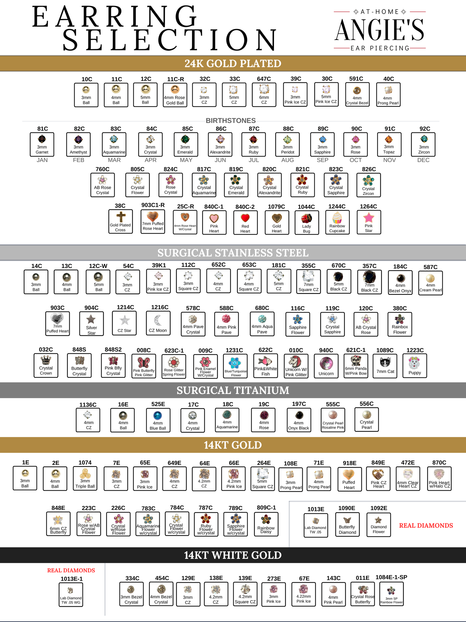 All of our piercing earrings are hypoallergenic and come in metal choices including 24KT gold-plated, medical grade stainless steel, medical grade titanium, 14KT gold and 14KT white gold. CZ means Cubic Zirconia.